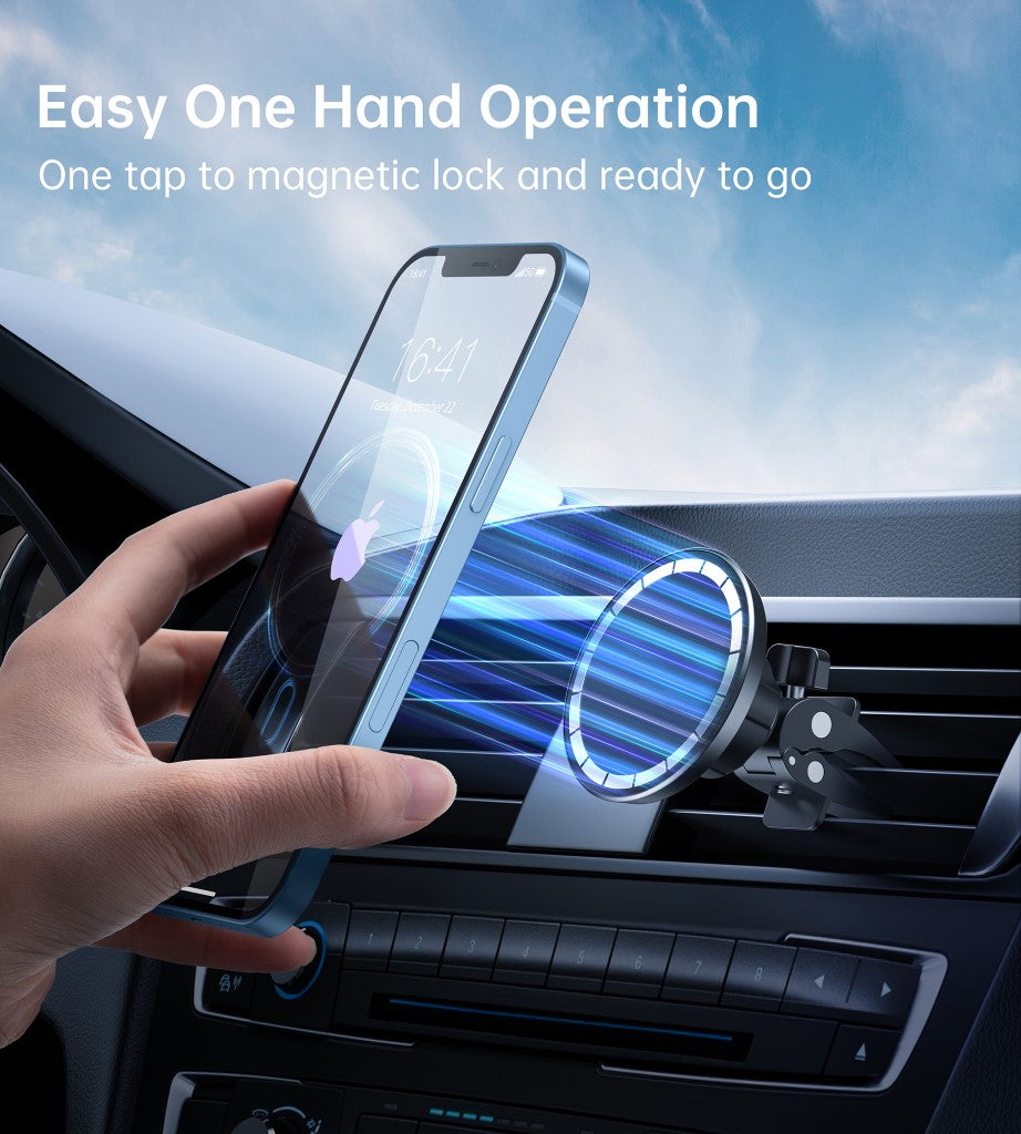 El soporte magnético para automóvil para iPhone 12 con rotación altamente flexible de 360° proporciona ángulos de visión infinitos. Coloca tu teléfono en el ángulo perfecto para disfrutar de una conducción más relajada y segura. La base del soporte magnético para teléfono celular para automóvil permanece fija en la salida de aire de su automóvil y no se mueve, sin importar cuánto gire o gire.