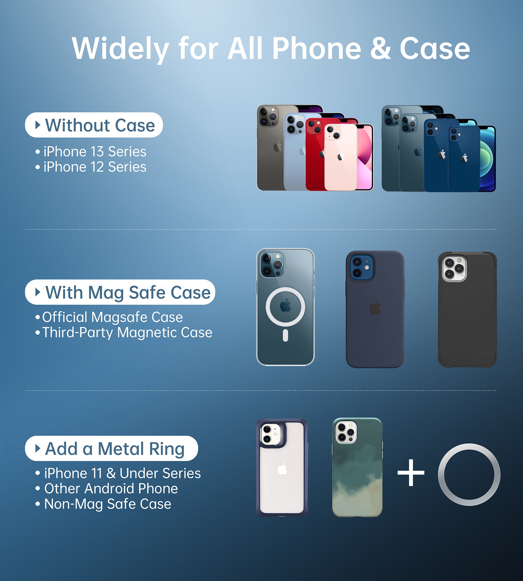 El soporte magnético para su Apple iPhone 12 Series, sin necesidad de ninguna placa magnética. La funda del teléfono debe ser una funda magnética MagSafe, o simplemente quítese la funda para sujetar su teléfono si la funda no es una funda magnética MagSafe.