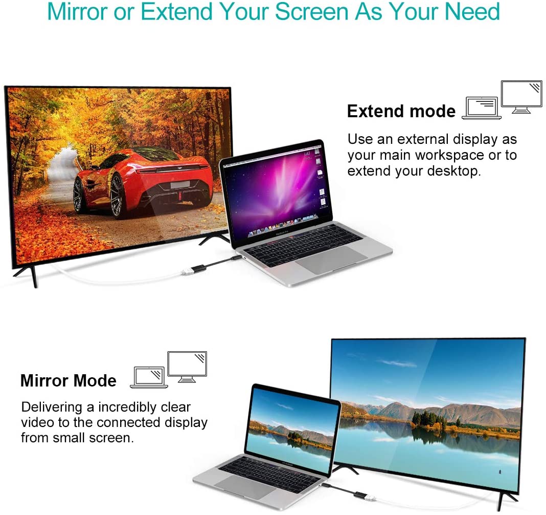 Disipación de calor: este adaptador HDMI está construido en un chip de autoenfriamiento, lo que significa que no es fácil de calentar, incluso el adaptador HDMI MacBook Pro funciona durante unas horas. Es más seguro para un uso prolongado, así como un mejor aislamiento del calor